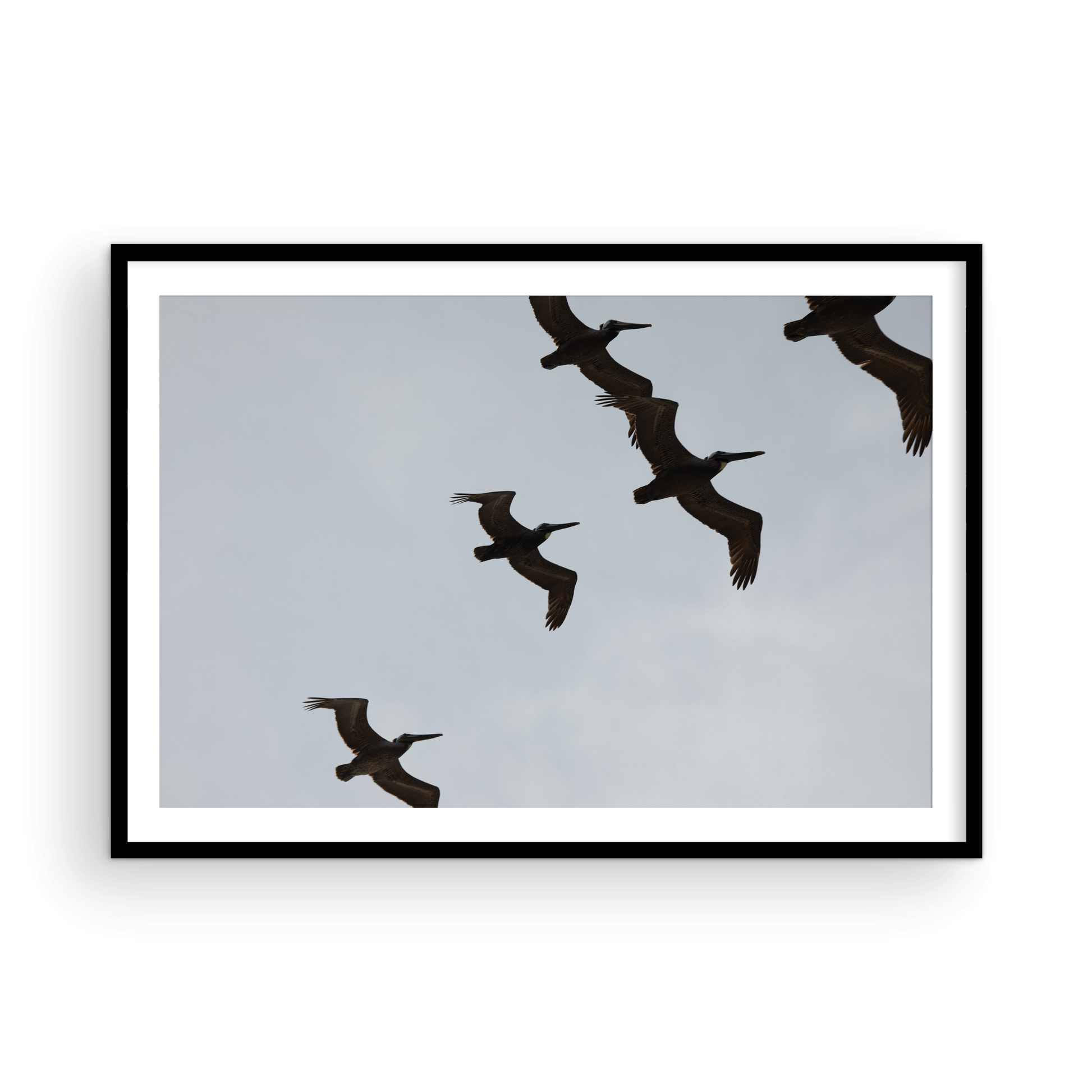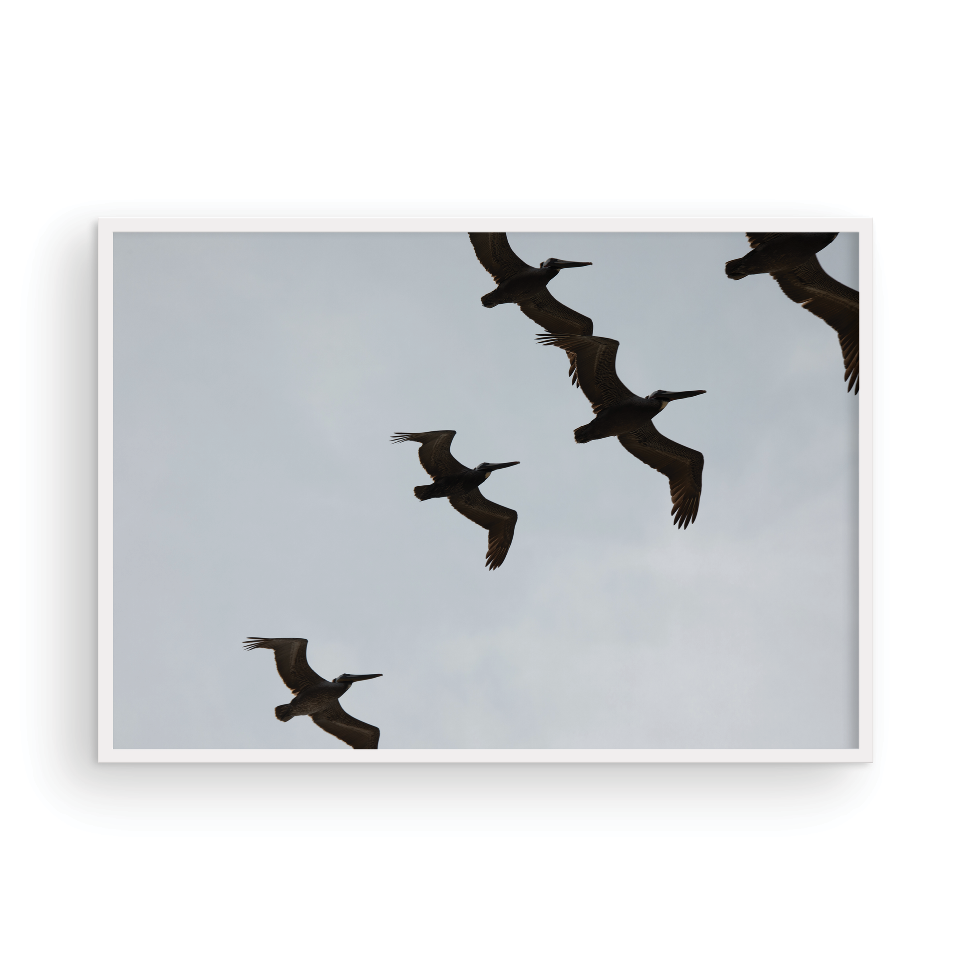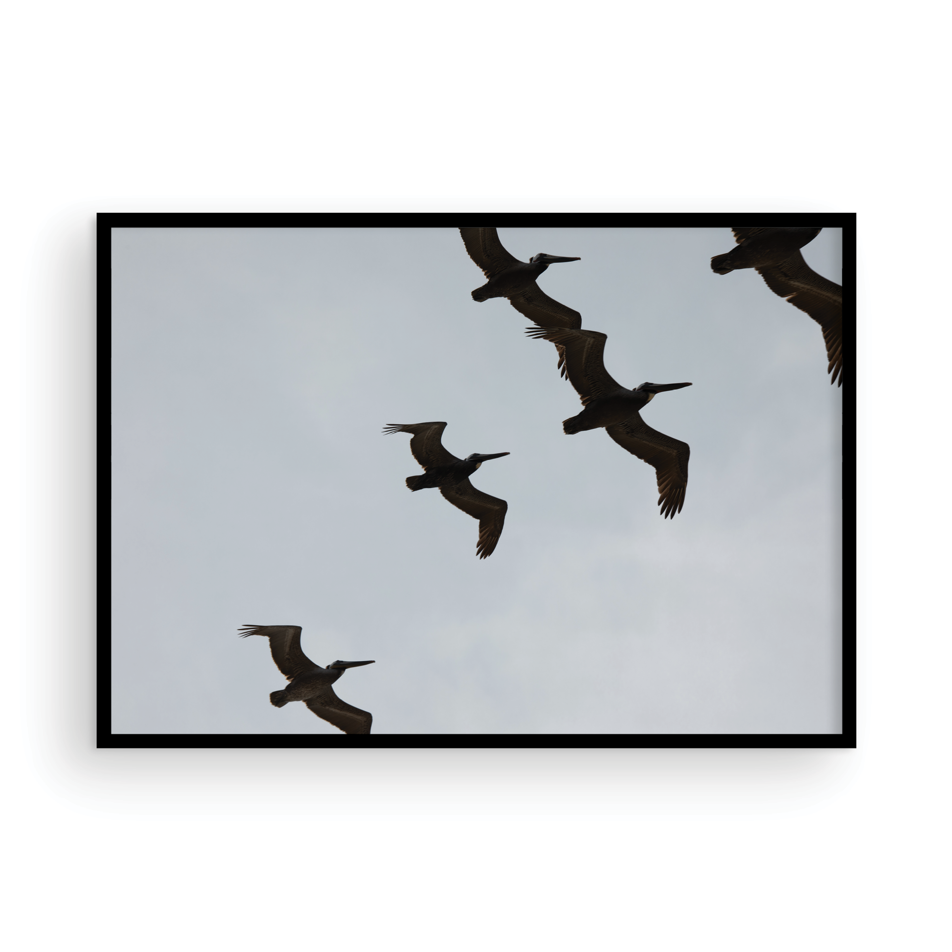 This unique image of pelicans in silhouette flying over the beach in Encinitas has a creative, dramatic feel to it. This framed image would look cool above a couch or in an office.