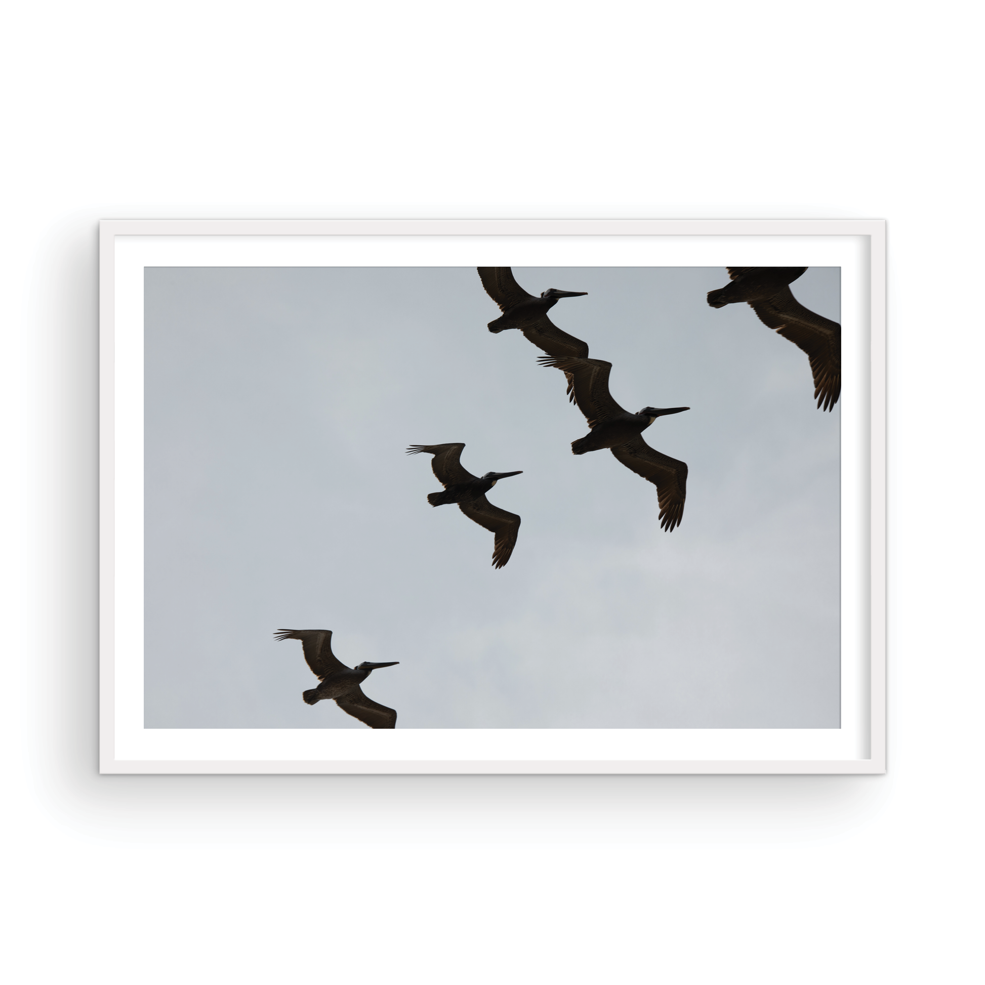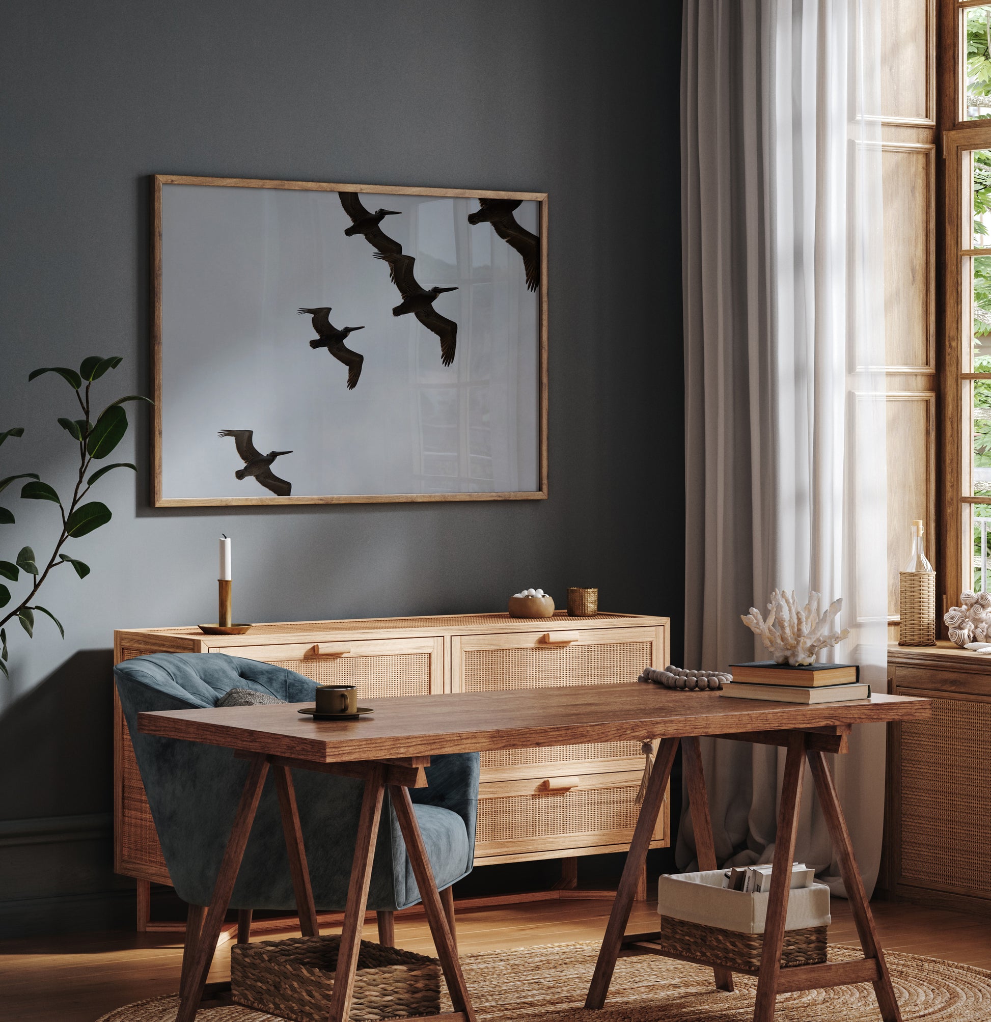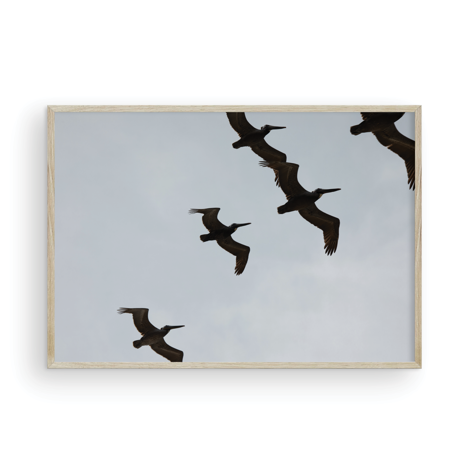 This unique image of pelicans in silhouette flying over the beach in Encinitas has a creative, dramatic feel to it. This framed image would look cool above a couch or in an office.
